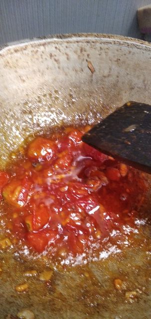 - 🌶 Setelah tomat hancur, masukkan 150 ml air biarkan sampai mendidih